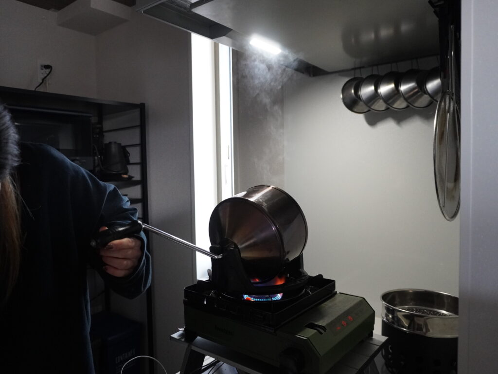 徐々に温度が上がりにくくなったり、豆の確認の際にスプーンを挿入することで、温度が一気に落ちたりと、普段より温度管理に振り回されていました。