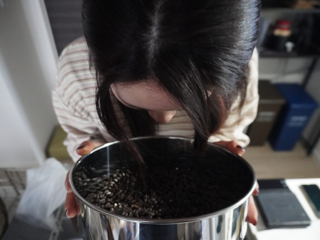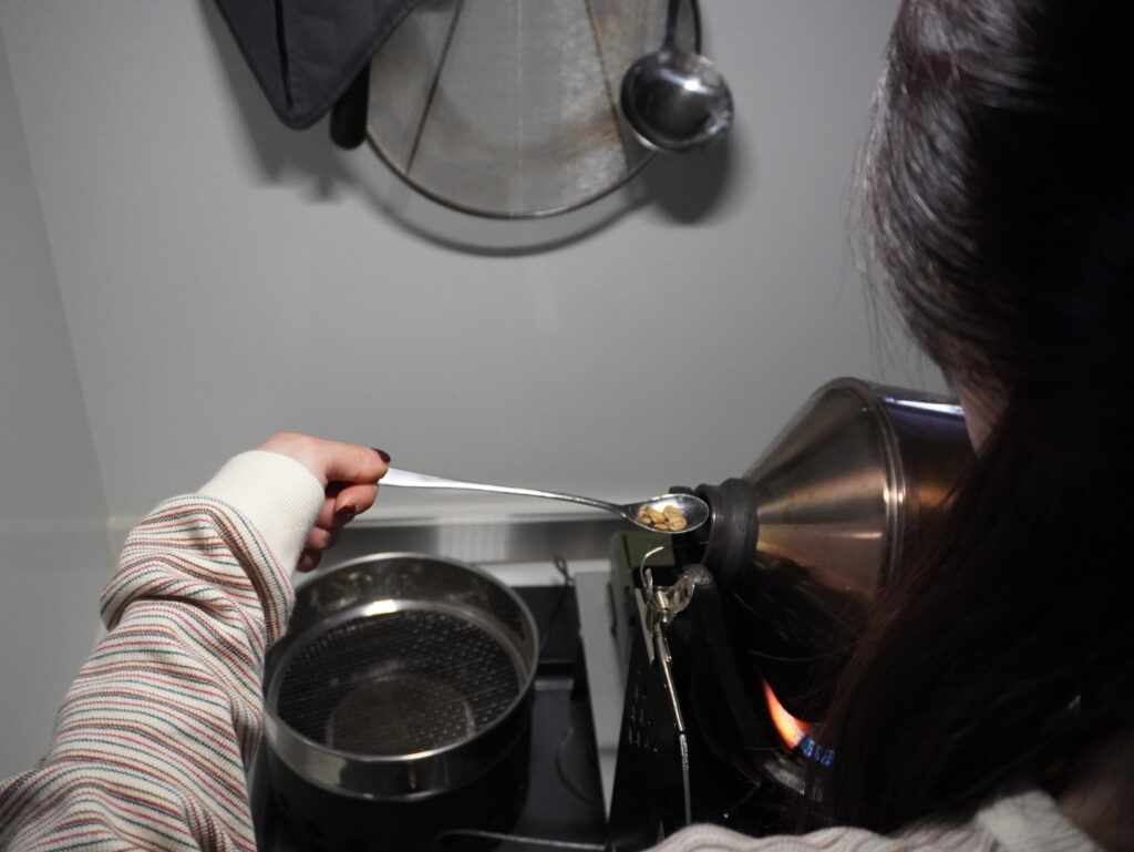 焙煎中もご機嫌で、スプーンで豆を確認しているときに、横から