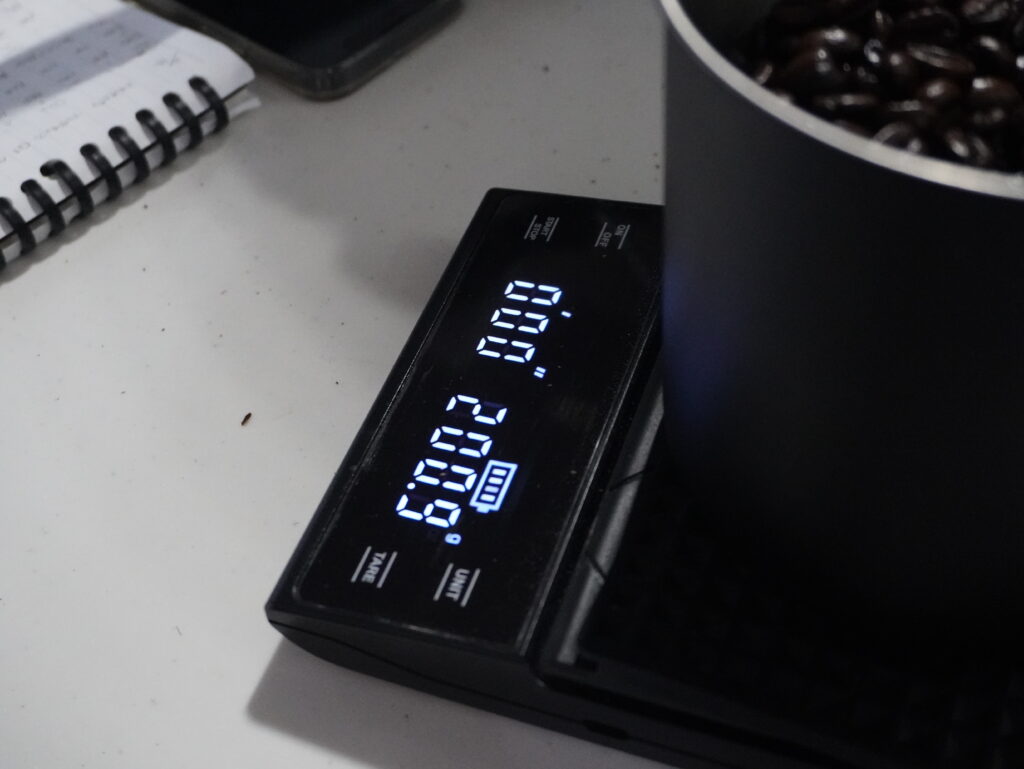 いつものように焙煎後の計量を済ませて、焙煎指数を計算していくこぶた。