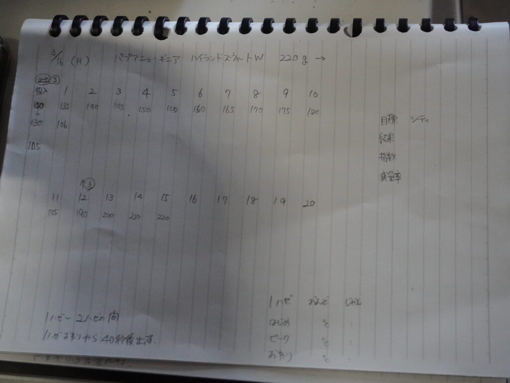 ところで、焙煎日記の書き方、若干変えてみました。なんか少しづつでも良くしていこうと思いながら余裕がなくて変えられてなかったので、ちょっとづつでも改善していこうと思います。