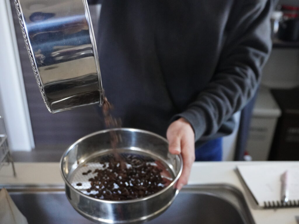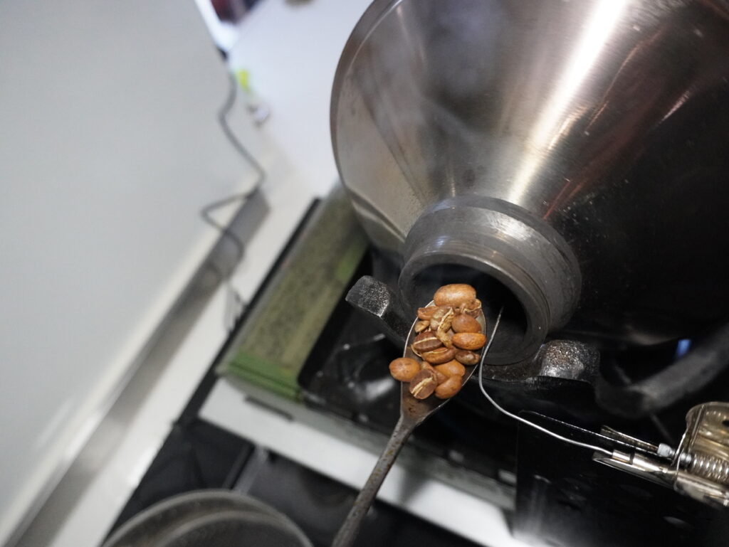 これまでは、焙煎終了間際に焦ってバタつくことが多かったこぶたでしたが、最近、狙ったタイミングより少し早めに火を切って、狙い時に釜から出すと言う工夫をするようになって、煎り止め前後に大慌てすることがなくなってきたようです👍