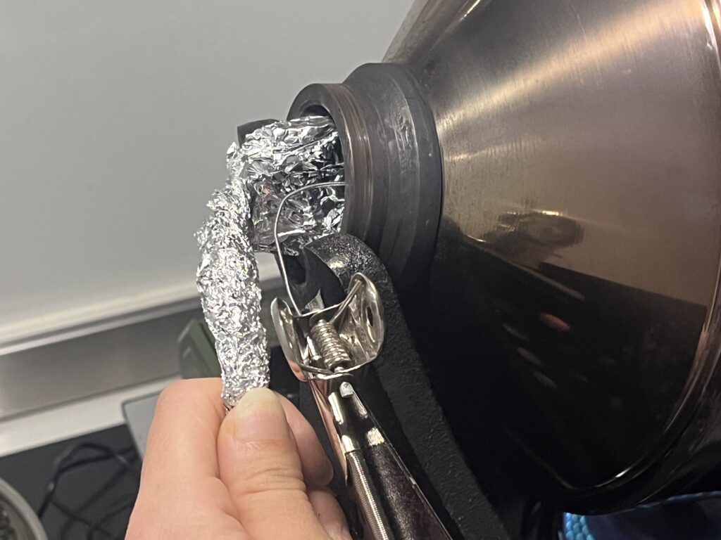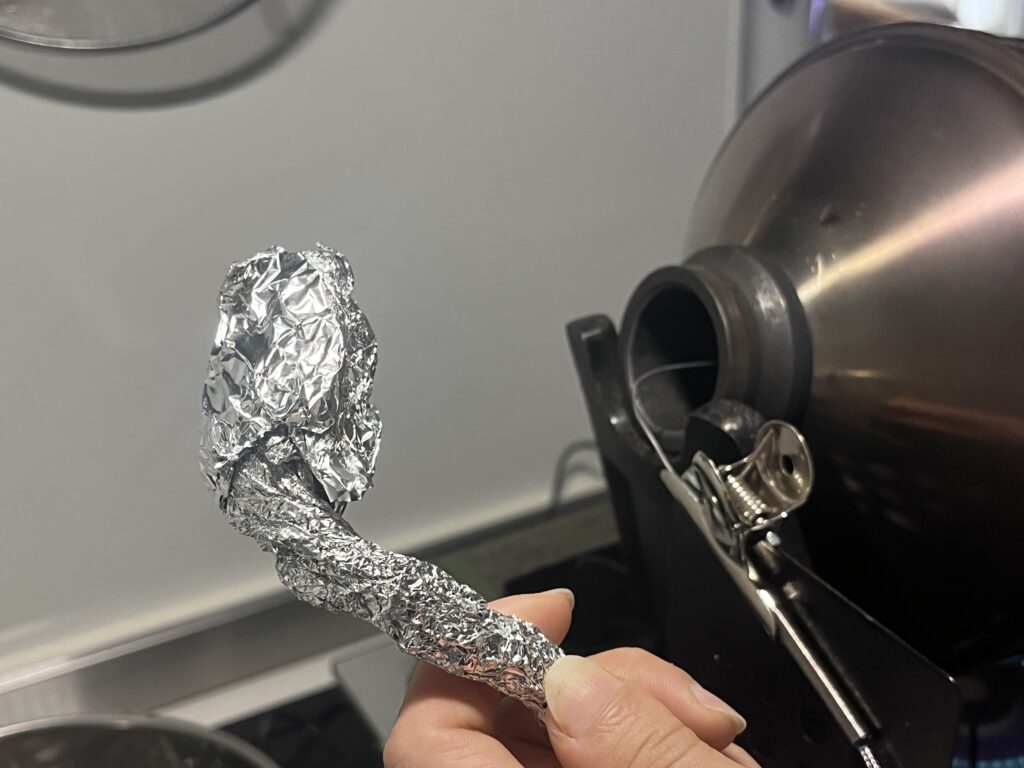 このアルミホイルで作った手羽先をブッ刺して蓋をするんですが、まーなんせ隙間だらけであんまり意味があるのか微妙なのと、温度計を差してるので、窯を回すたびに巻き込んでしまうわで、なんか途中で捨てとりましたねこの手羽先。