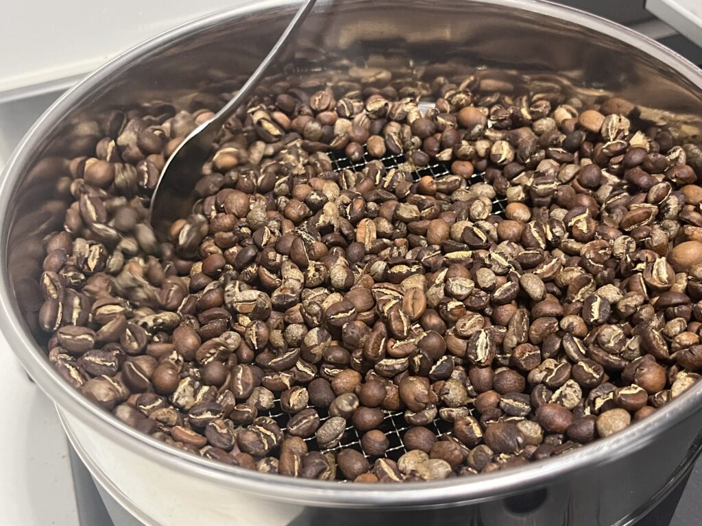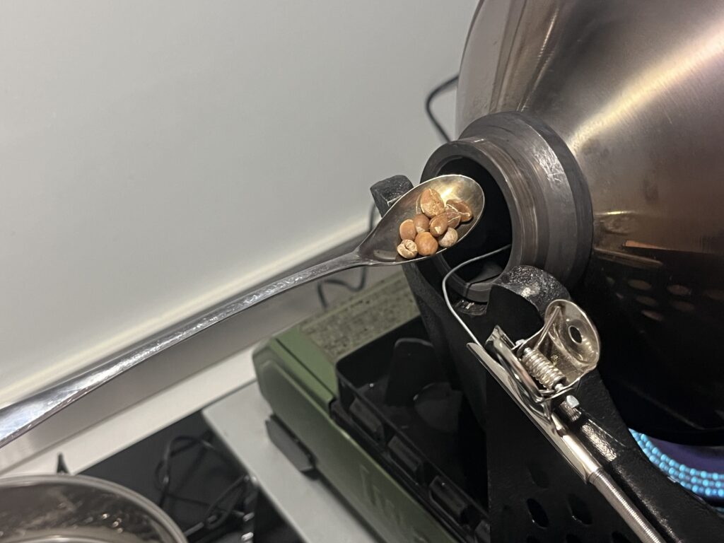 煎りすぎを考慮して、1ハゼ開始で火を消して、しばらく待ってから窯から出した結果、狙いより浅煎りになったのではないか、というところですが、見た目的にもムラがあり、あまり綺麗ではない。