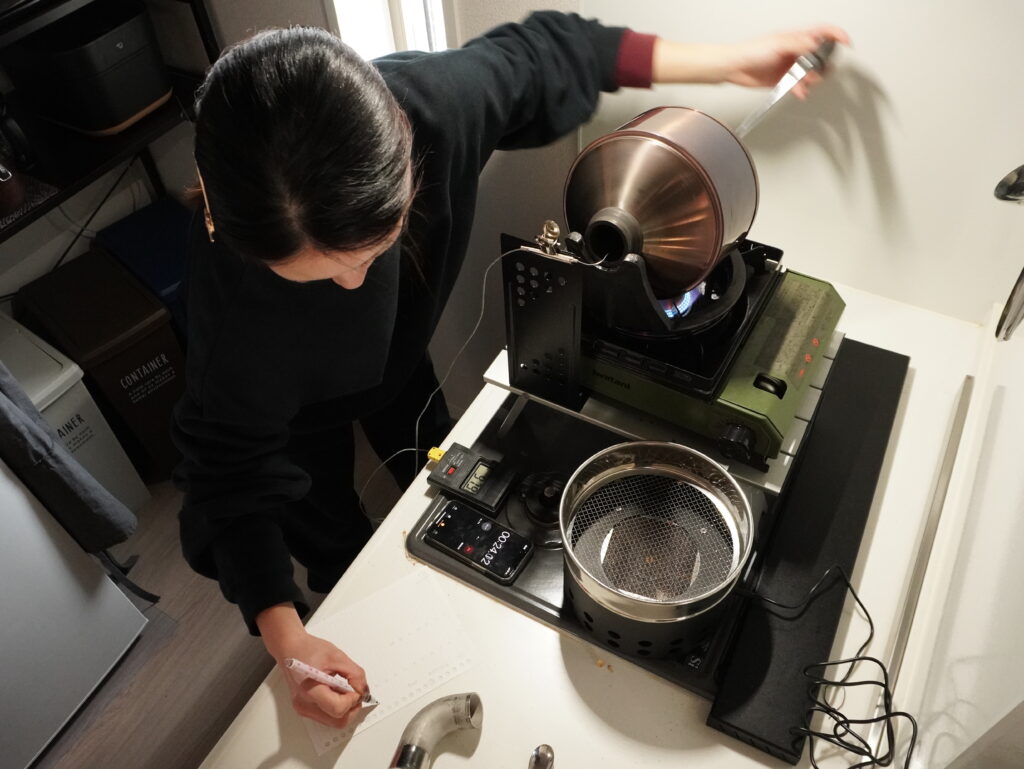 • 窯内の温度で1ハゼが鳴り始めるのを予測できるようになってきて、1ハゼが早かった豆の音に惑わされないようになってきた!