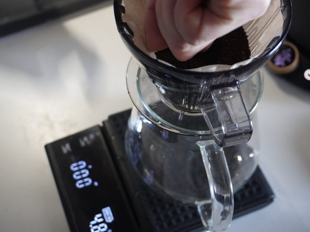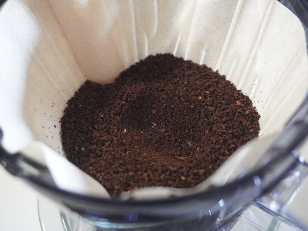 こうすることで、お湯が片方に流れて行ったりしにくくなって、バランスよく、粉全体に行き渡りやすくなります😃