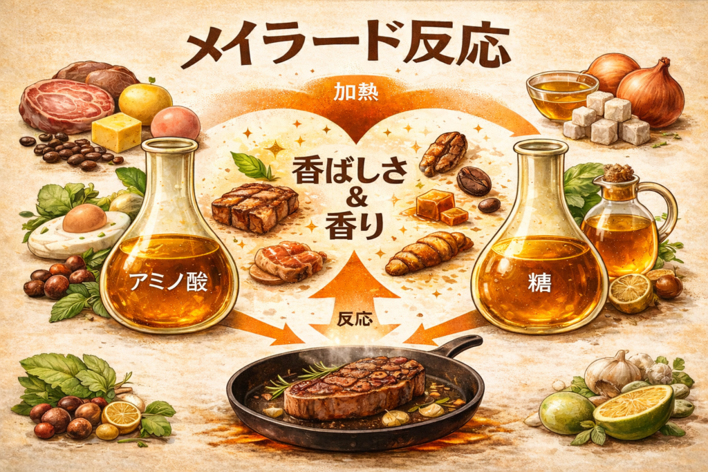 メイラード反応とは、糖とアミノ酸が加熱によって反応し、褐色化や香り成分を生み出す化学反応です。
