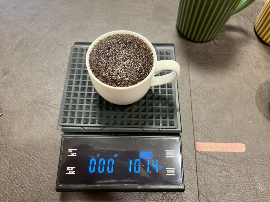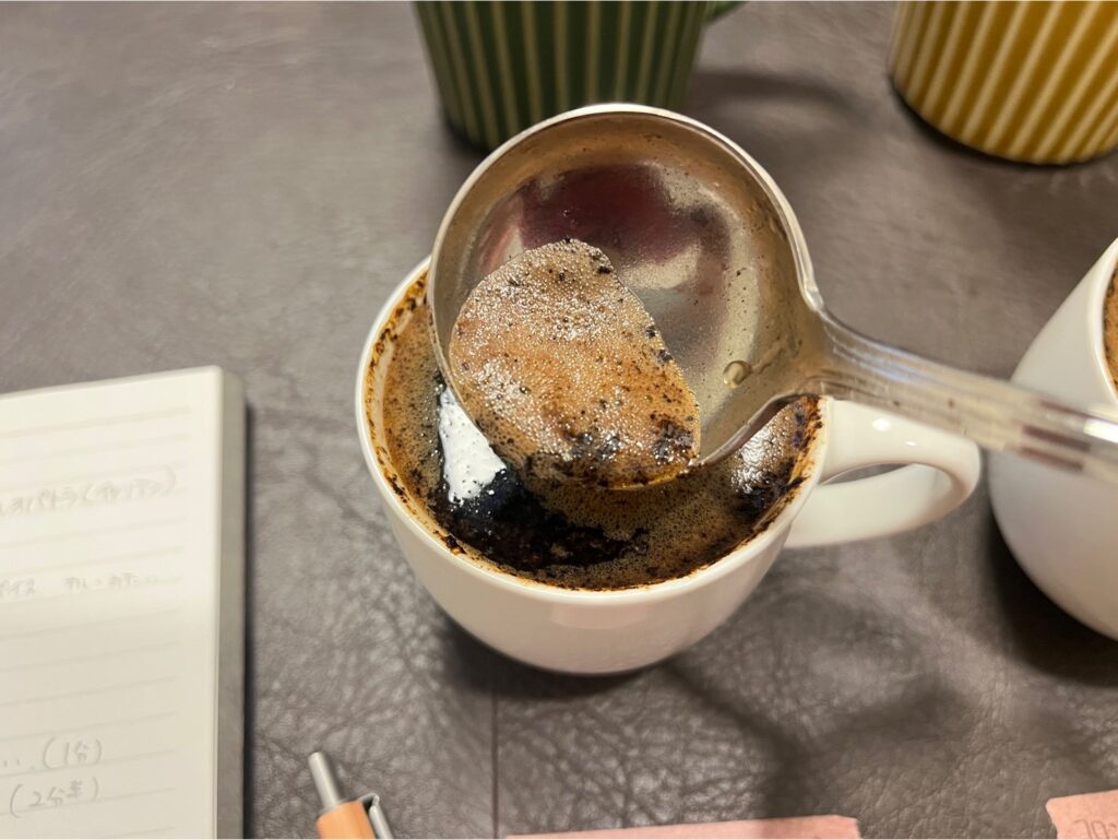 コーヒーカップ内を3回掬い上げるように混ぜ(この工程をブレイクと言います)、香りをクンカクンカ🐽何か気付いたことがあれば、都度メモを取ります📝