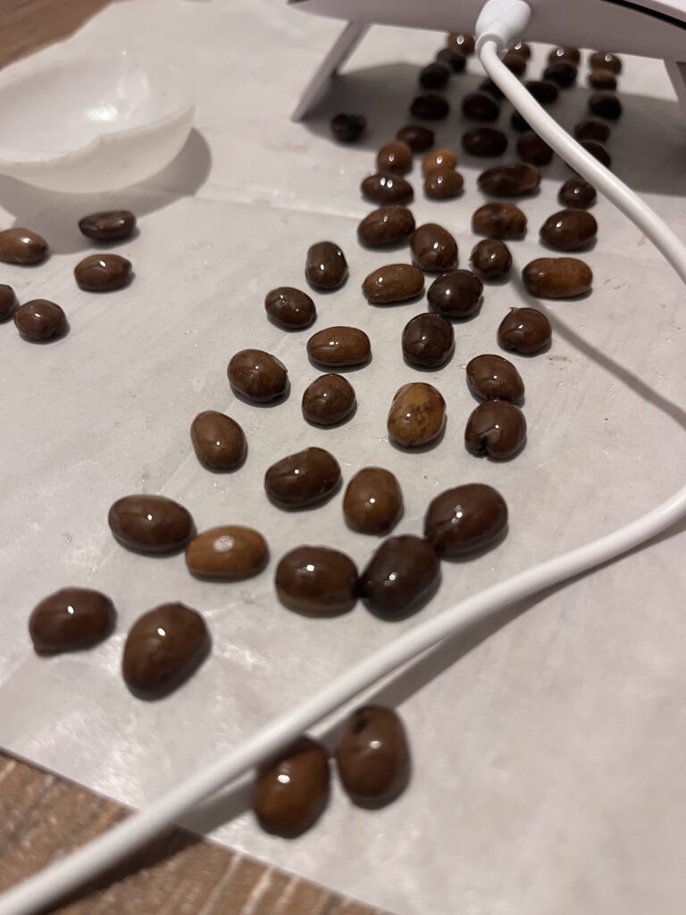 なにしろたくさんの欠点豆達が必要で、その子達をたくさん加工していかなければならないので、加工待ちの行列ができるんです👇