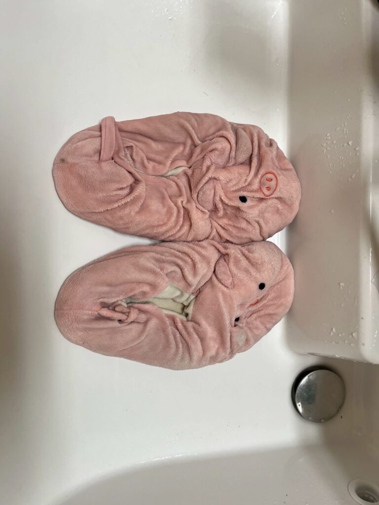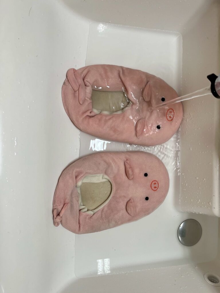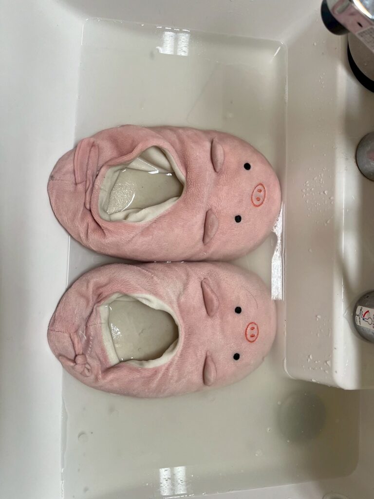 中学生くらいからお世話になっているブタさんスリッパ。定期的にお風呂に入れていたが、こんなに汚れていたとは衝撃…。